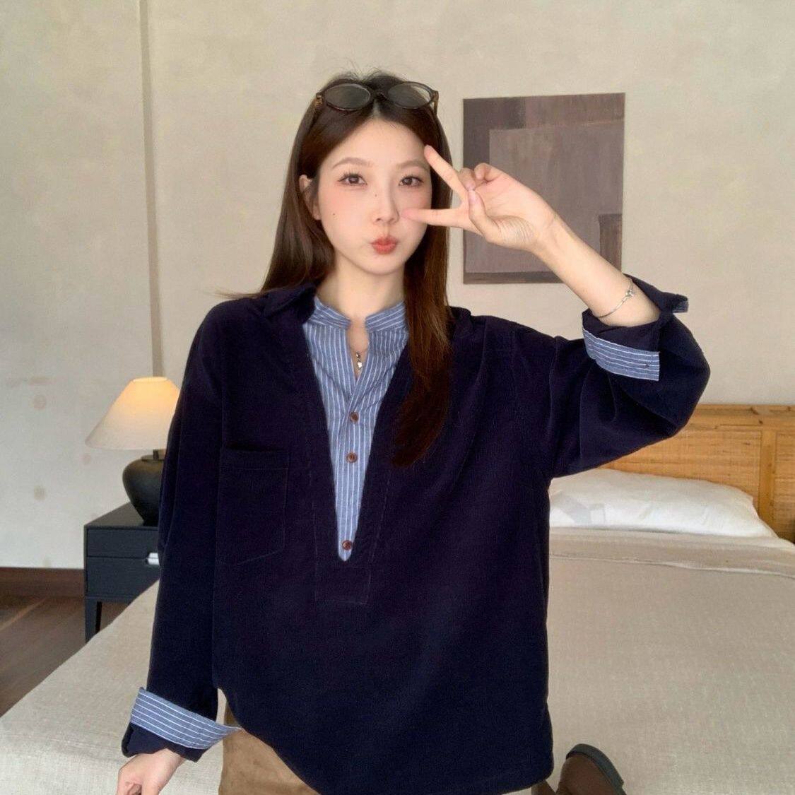 蓝色拼接条纹假两件灯芯绒中长款衬衫女2025新款巨好看的早秋上衣