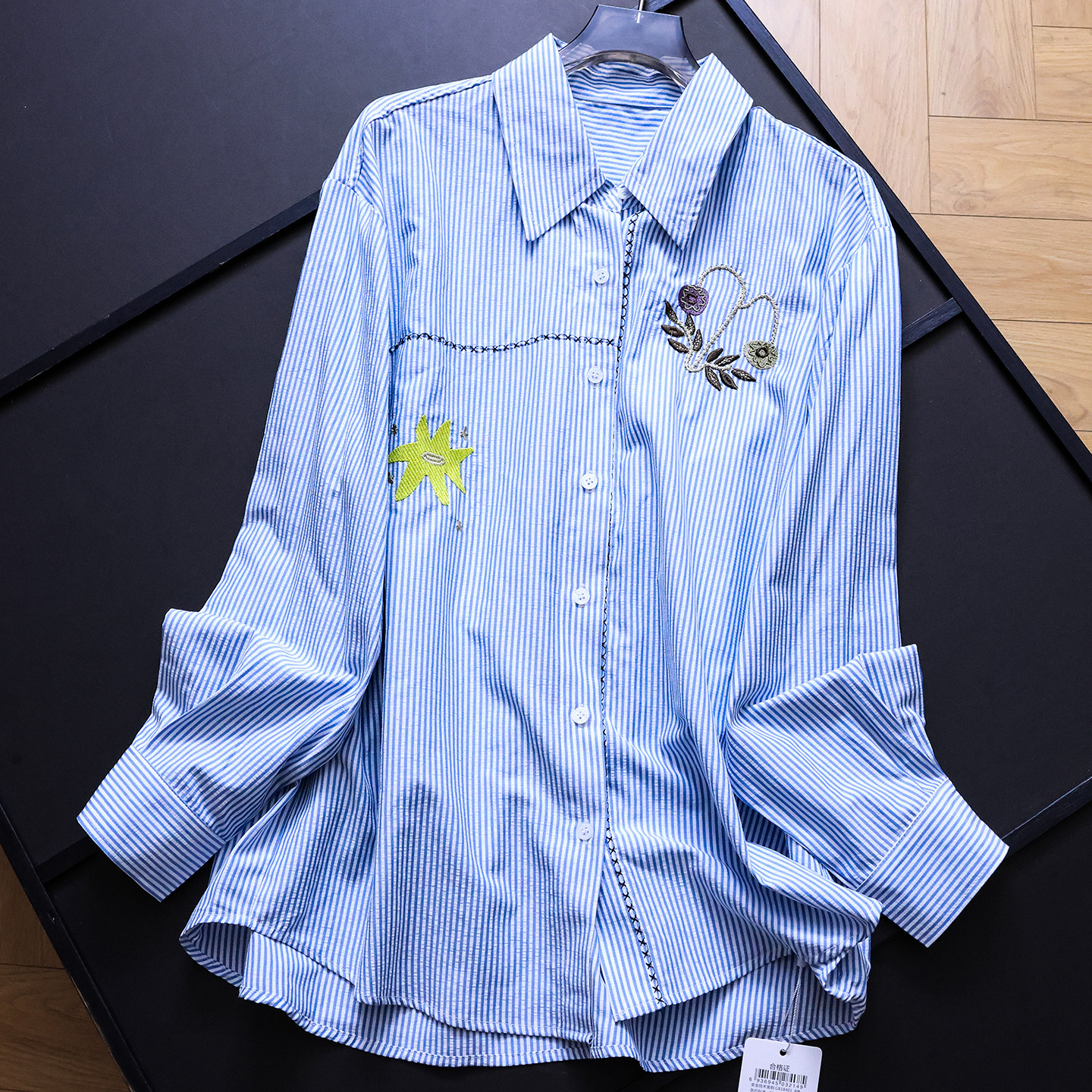 花朵刺绣蓝色条纹宽松中长款肌理2025秋季新款长袖百搭女衬衫B292