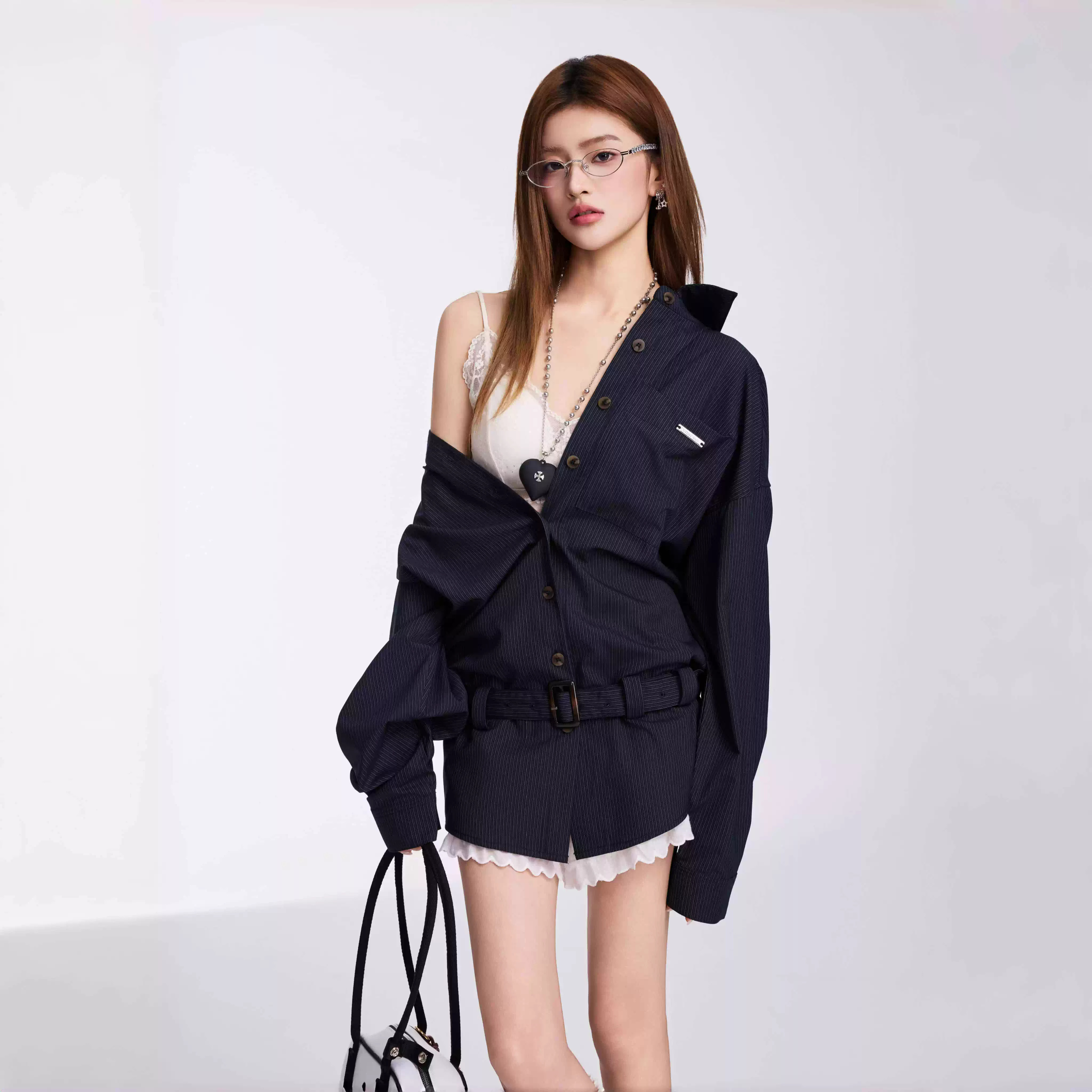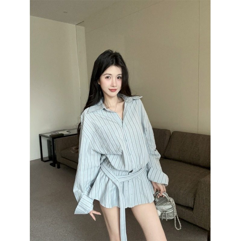 OTEBANBASS25SS腰带条纹衬衫女宽松时尚气质中长款藏蓝色慵懒衬衣