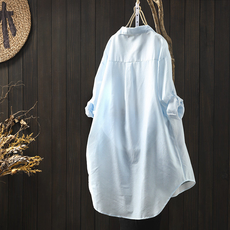 韩系蓝色条纹衬衫大码中长款宽松防晒开衫女春夏翻领落肩长袖衬衣