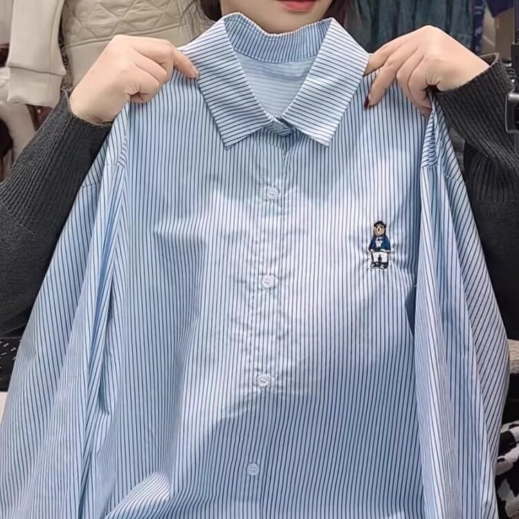 日系刺绣小熊蓝色条纹衬衫女中长款2025秋上新宽松长袖学院风上衣