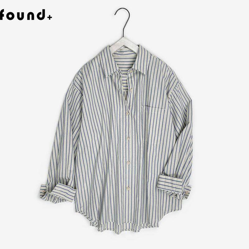 25M01FOUND+2025春 慵懒宽松蓝色条纹衬衫女中长款男友风衬衣纯棉