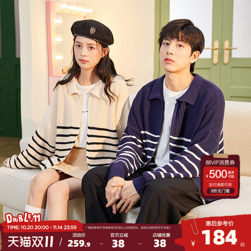 唐狮2023秋冬季情侣毛衣开衫外套男拉链条纹宽松新款女生毛线衫潮