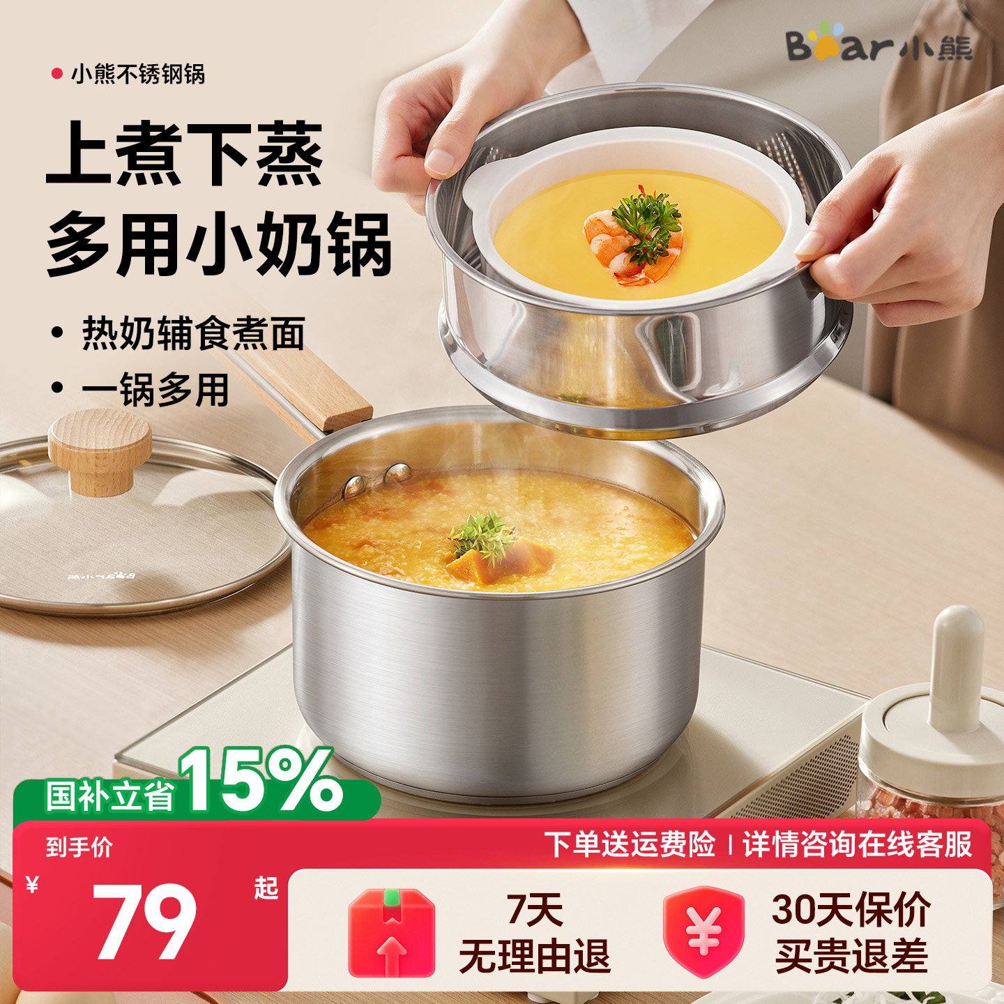 小熊小奶锅婴儿宝宝辅食锅不锈钢煮泡面锅蒸煮一体无涂层不粘汤锅