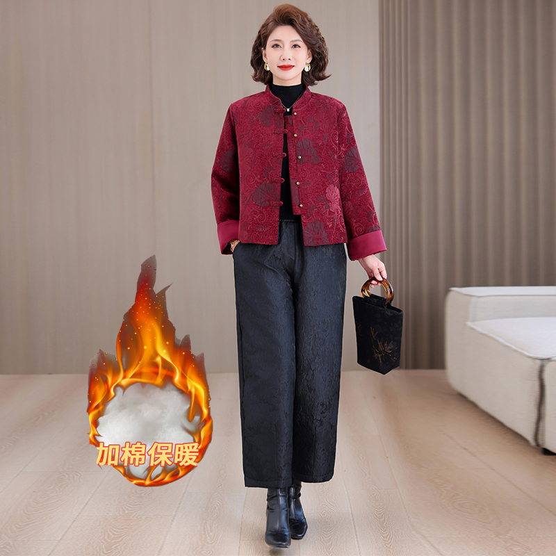 新中式棉服阔腿裤套装女冬季新款立领提花妈妈夹棉两件套外套女秋