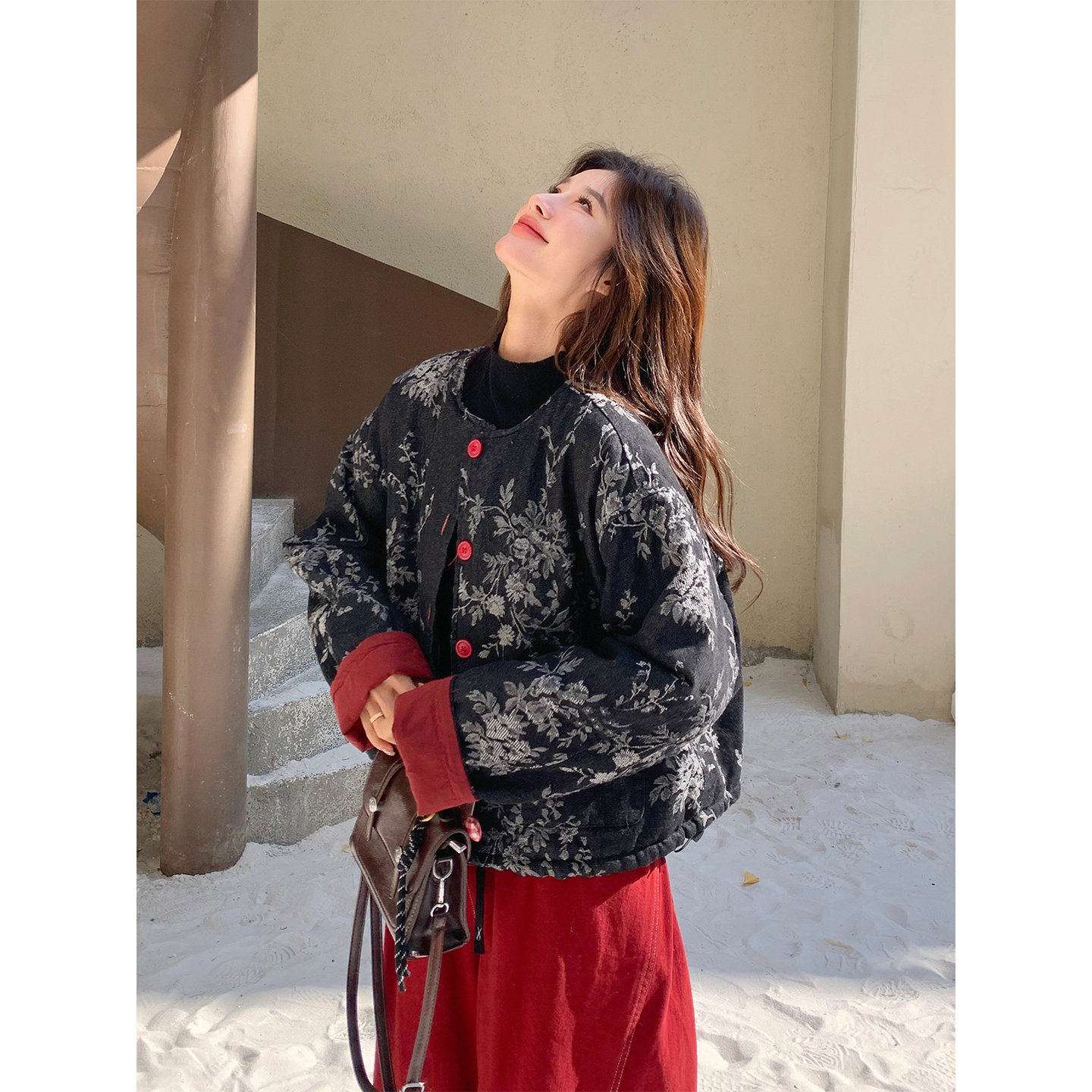 冬季套装女2025新款女学院风棉服马甲红色毛衣加绒阔腿裤三件套