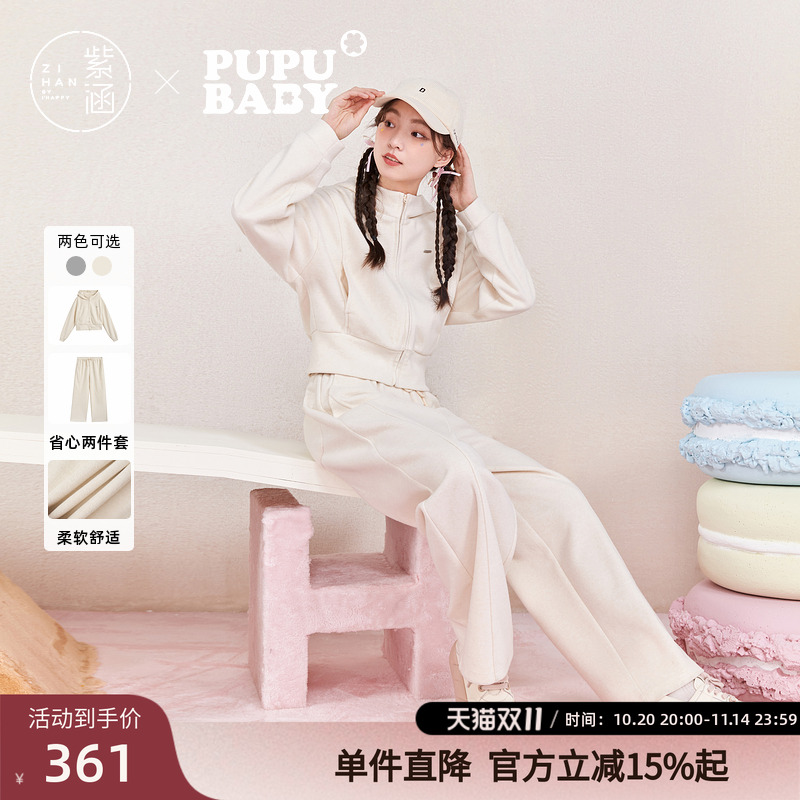 紫涵短款收腰连帽上衣直筒阔腿宽松休闲裤两件运动套装女冬季新款