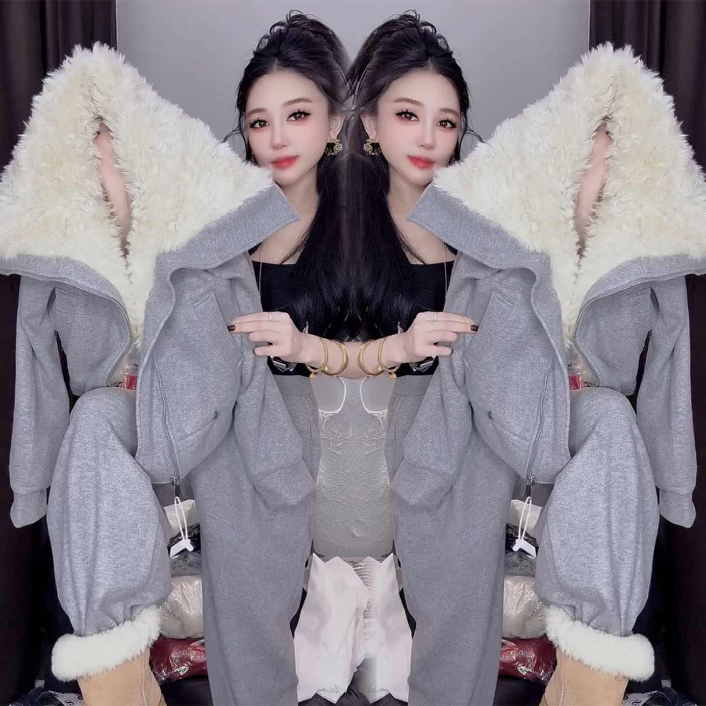 3MER哦哦三妹可拆卸毛领加绒卫衣套装女冬慵懒休闲阔腿裤子两件套