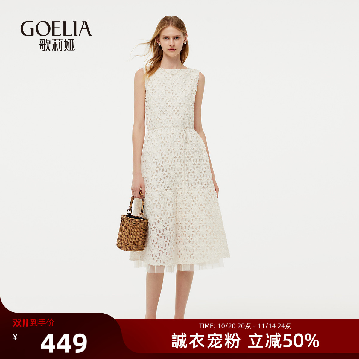 Goodland美地白色镂空蕾丝绣花法式连衣裙收腰仙女裙LC34305260