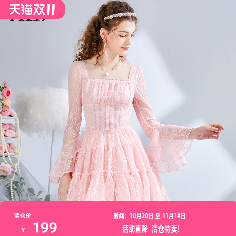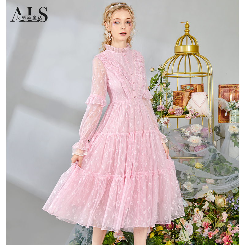 艾丽丝2025秋季新款复古粉色刺绣中长款连衣裙甜美蕾丝显瘦仙女裙