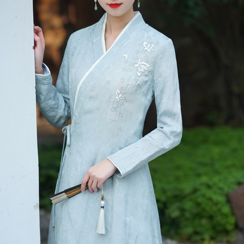 秋意浓 秋季新款仙女民族风绣花天丝棉麻修身改良交领汉服连衣裙