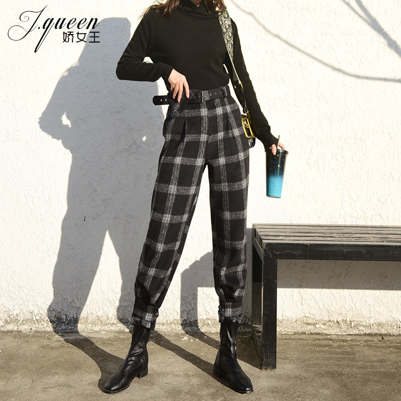 毛呢格子哈伦裤女新款秋冬加厚束脚时尚休闲高腰小脚靴裤萝卜裤子