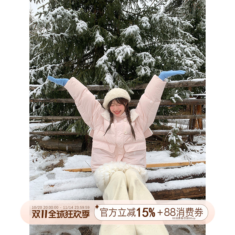 森女部落甜美90白鸭绒设计感粉色羽绒服女新款宽松保暖三防外套冬