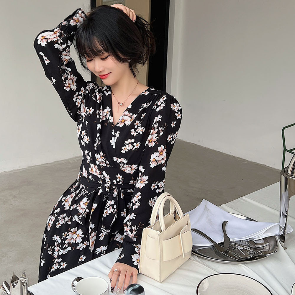 黑色碎花连衣裙女2021年新款春秋打底气质收腰中长款长袖雪纺裙子