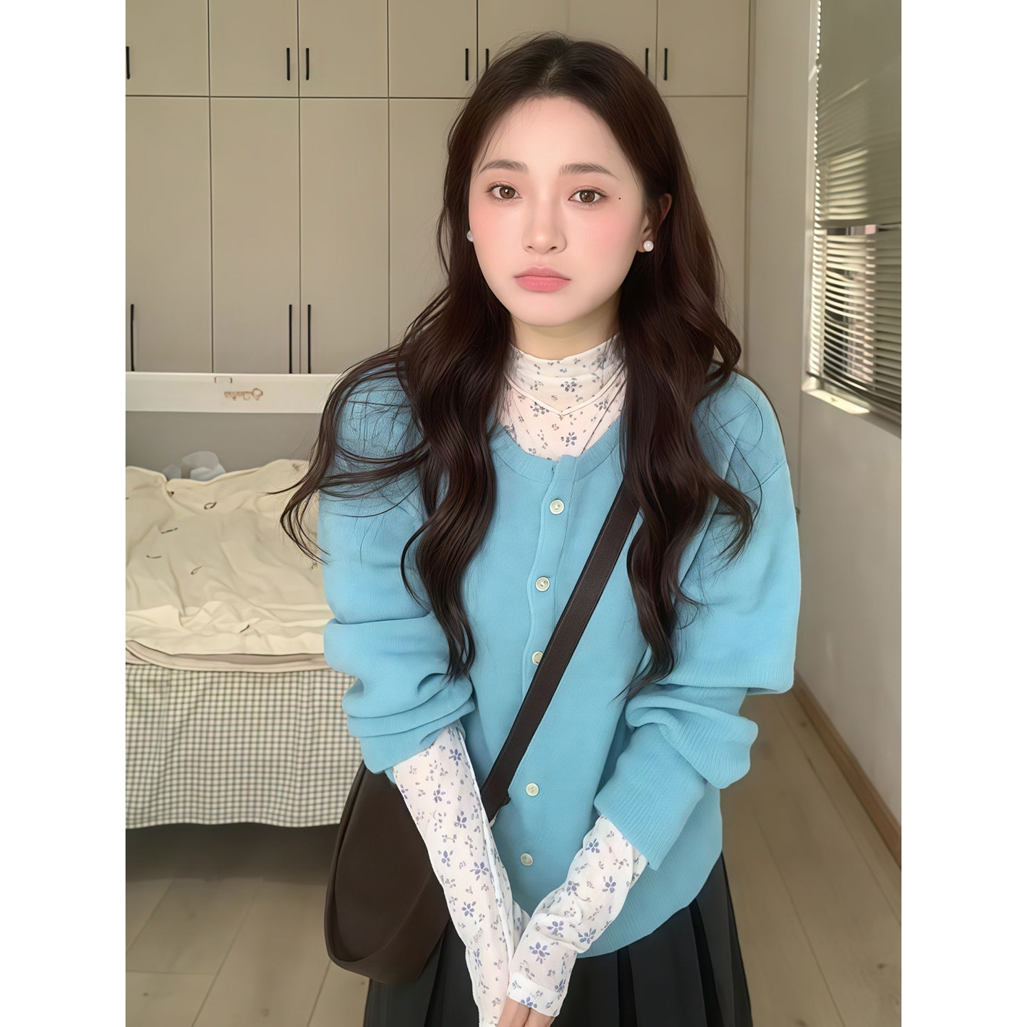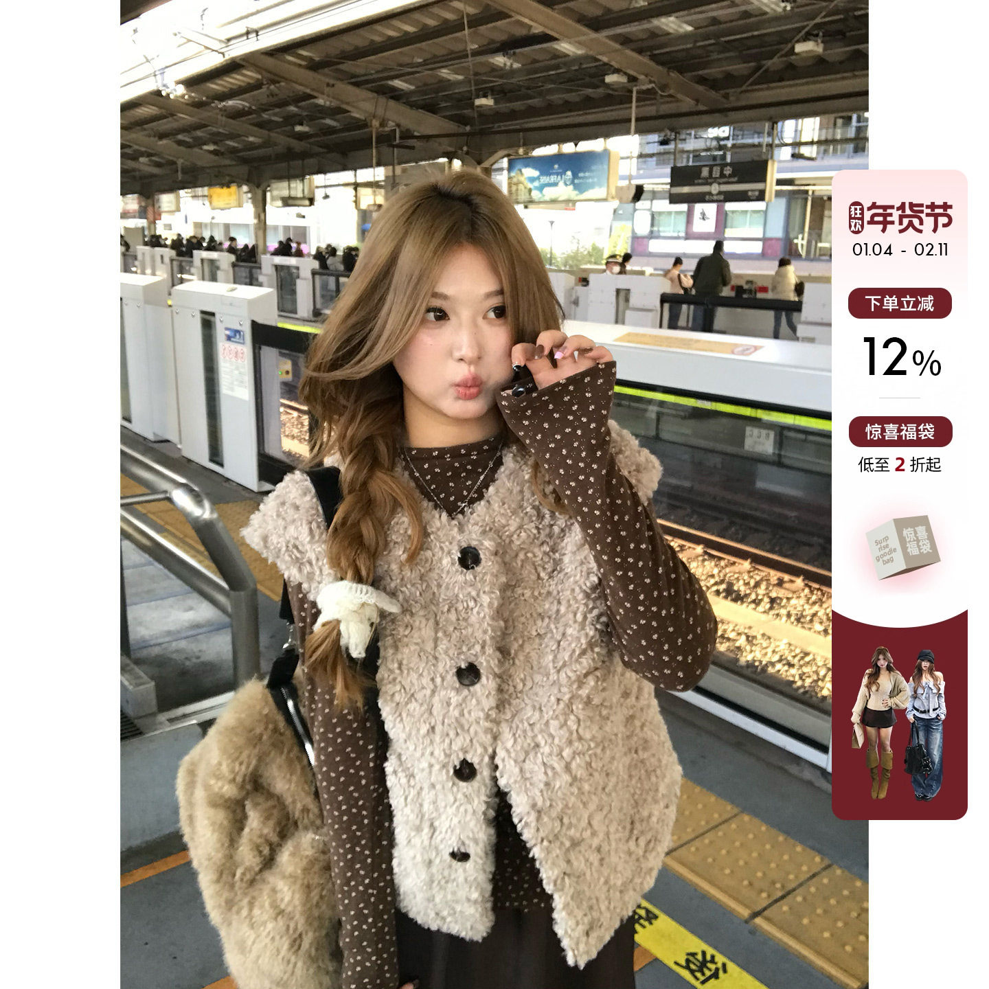 你的鱼 焦糖泡芙 韩系微胖mm甜美碎花长袖打底毛绒马甲半裙套装