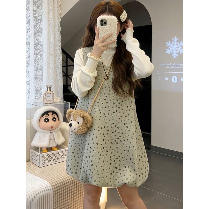 秋冬温柔甜妹U领无袖碎花花苞背心连衣裙+长袖针织打底衫两件套装