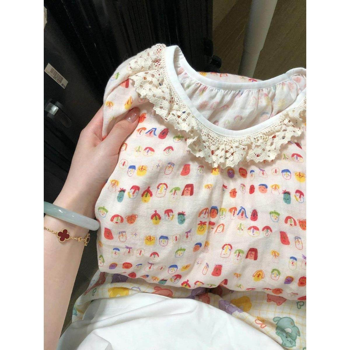 100%纯棉纱长袖睡裙女涂鸦小人中长款裙子碎花连衣裙打底裙春秋款