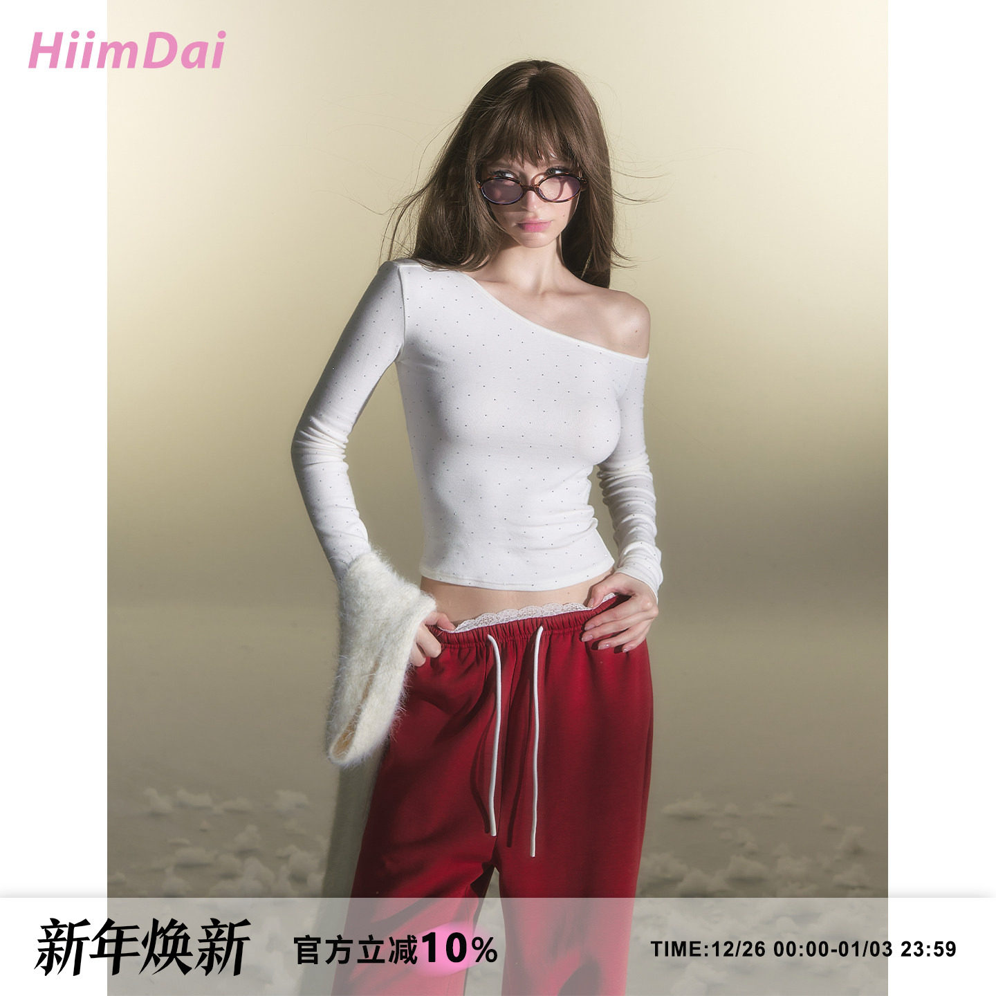 HiimDai 满天星 肤感满钻针织 辣妹露肩修身斜肩显瘦长袖打底T恤