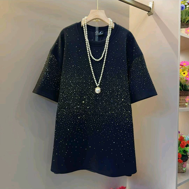 满天星重工烫钻圆领正肩t恤女春季2026新款宽松中长款短袖上衣潮