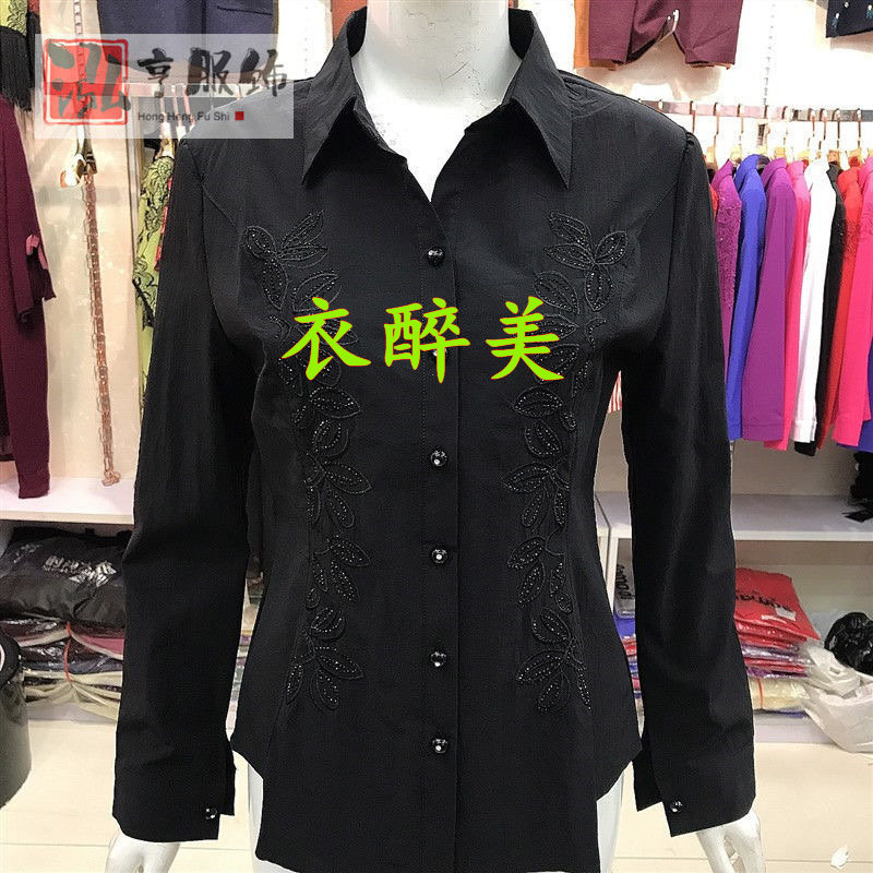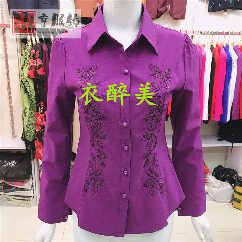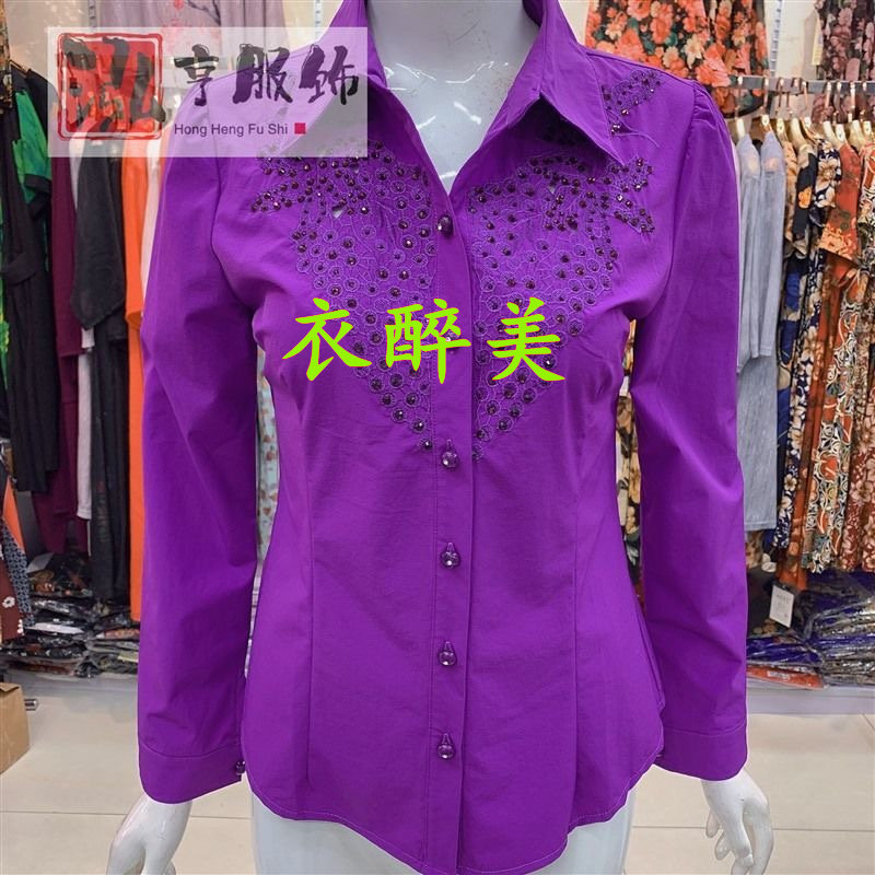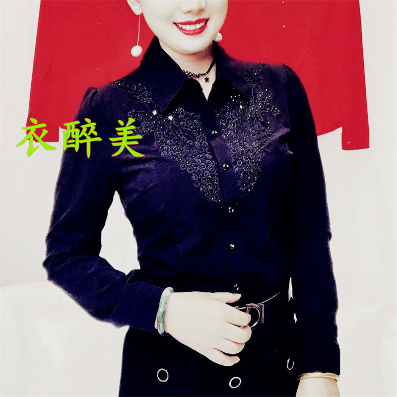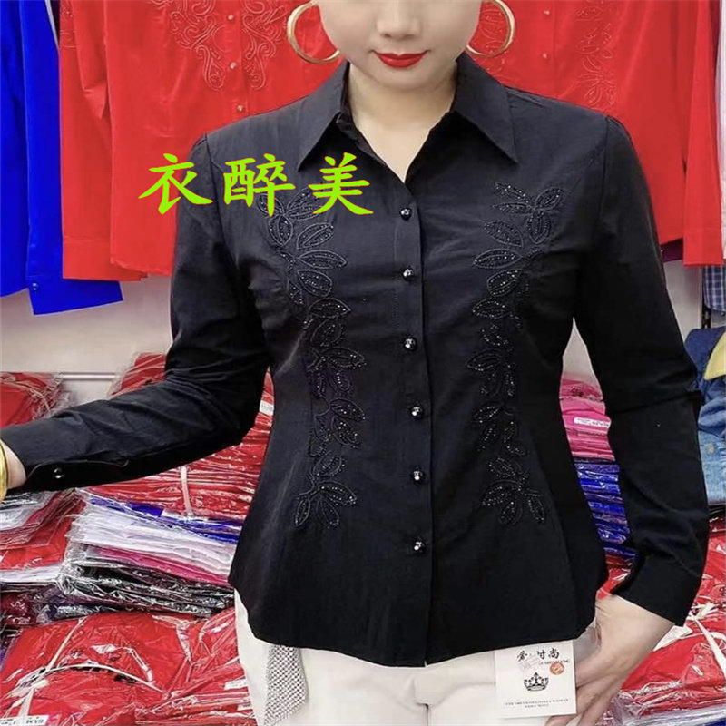 新款中老年女士长袖绣花镶钻衬衫纯色时尚百搭大码修身显瘦有弹力