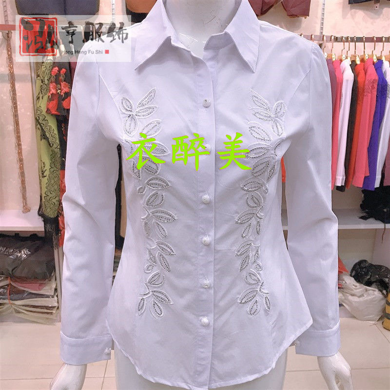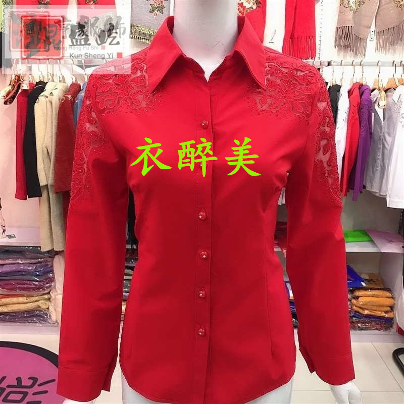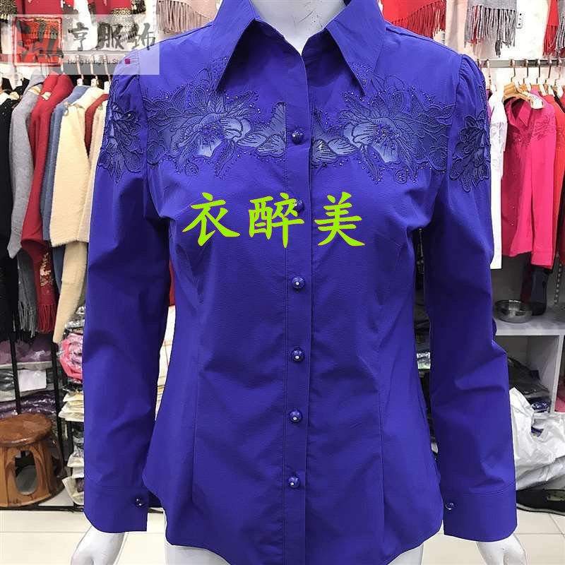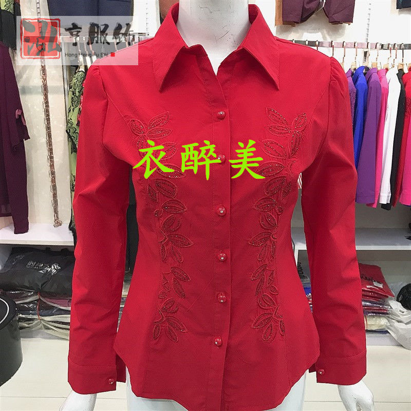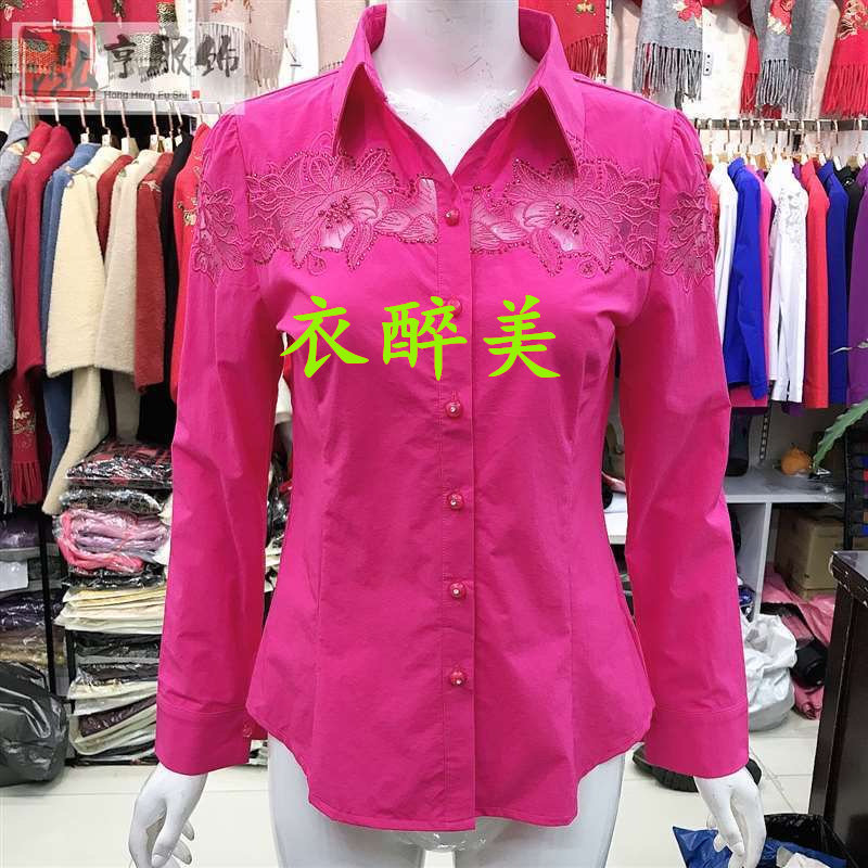 新款中老年女士长袖绣花镶钻衬衫纯色时尚百搭大码修身显瘦有弹力