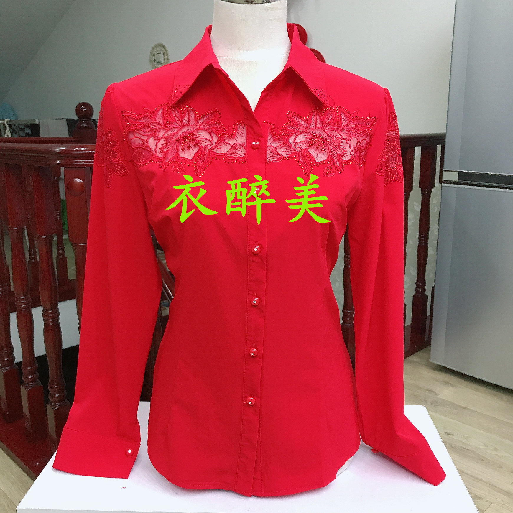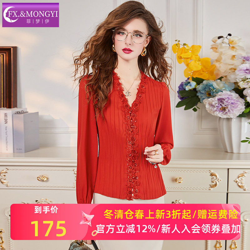 菲梦伊红色绣花衬衫女长袖春季立体压褶本命年修身气质V领OL上衣