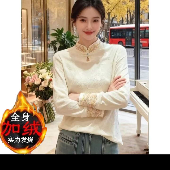 轻奢女装2026春新中式立领丝绒上衣女修身重工刺绣长袖气质T恤衫