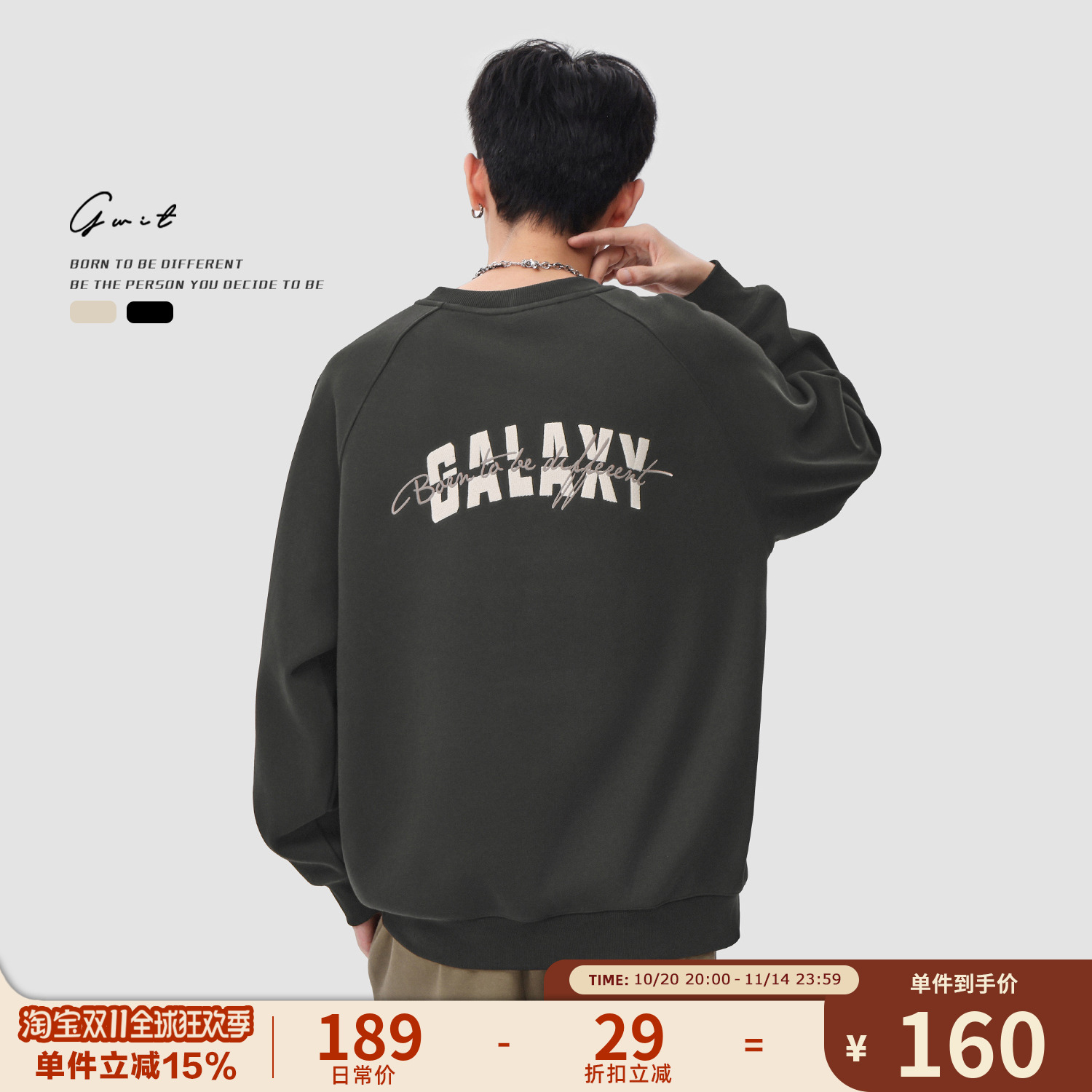 GWIT 重磅潮牌刺绣冬季保暖打底衫上衣套头衫加绒加厚圆领卫衣男