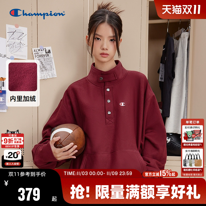 Champion冠军卫衣男2025冬季新款刺绣红色立领按扣加绒美式复古风