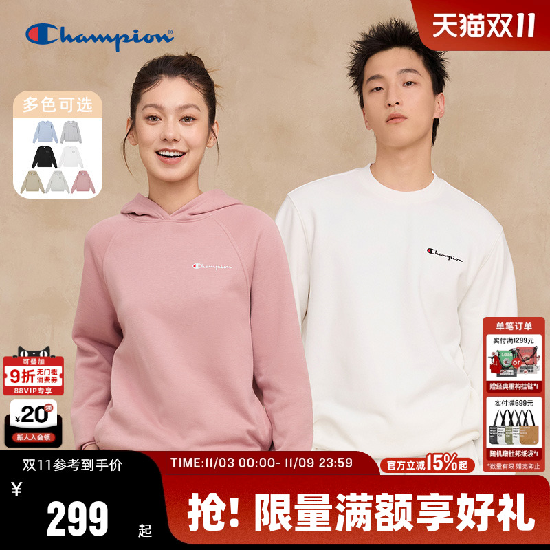 Champion冠军加绒卫衣男2025冬季新款刺绣草写logo连帽休闲风情侣