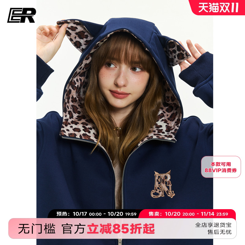 ER豹纹小狗耳朵连帽开衫加绒卫衣男2025秋冬街头风刺绣小高领外套