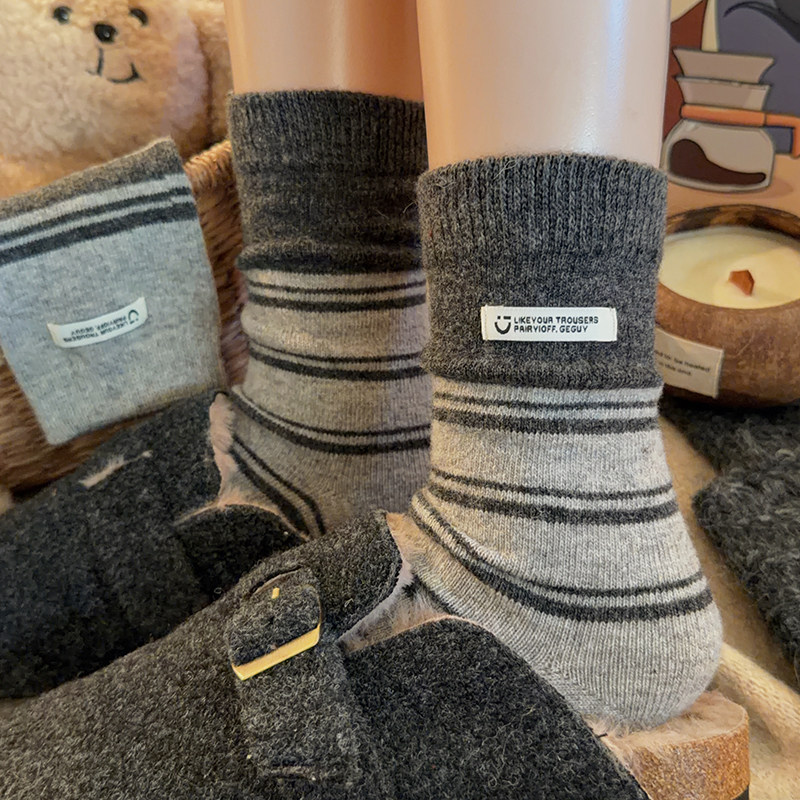 布标条纹袜子女羊毛袜秋冬季加绒加厚保暖冬天灰色中筒袜羊绒长袜
