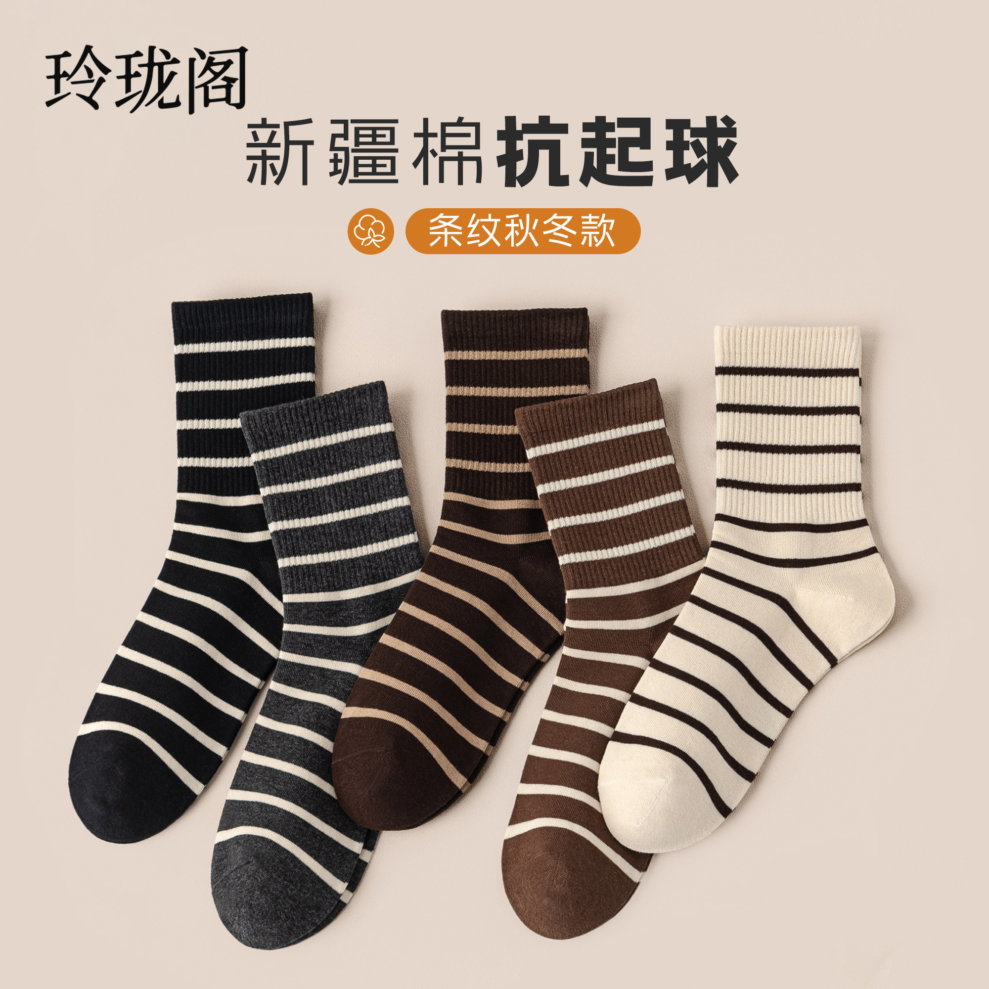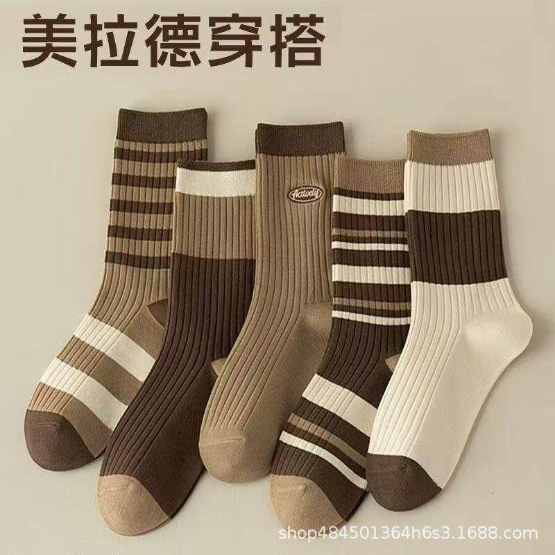 美拉德条纹袜子女咖色中筒袜优质棉袜女士配乐福鞋高腰新疆棉秋冬