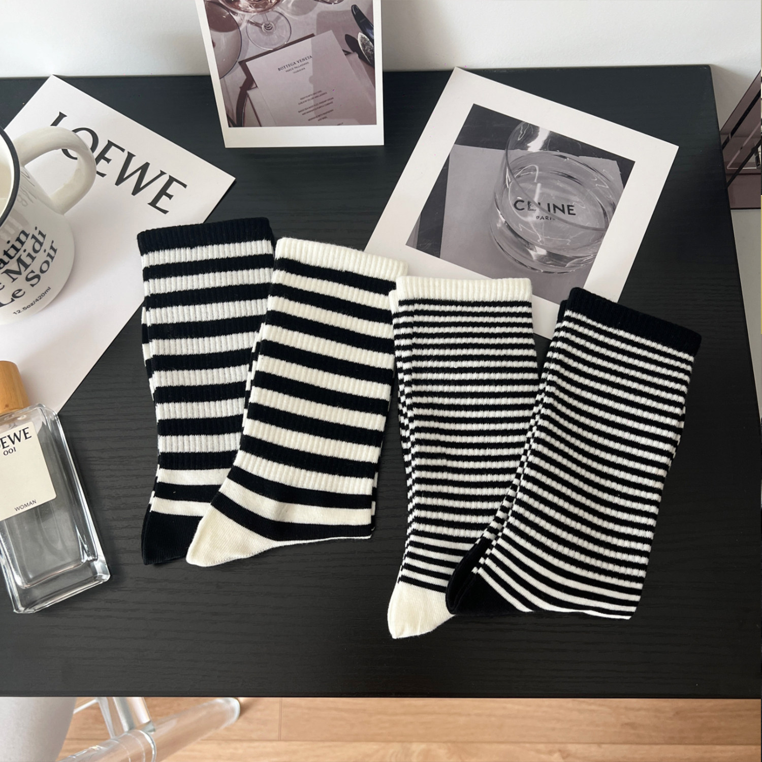 美拉德黑白条纹袜子女款中筒袜秋冬季高质量纯棉无骨袜长袜堆堆袜