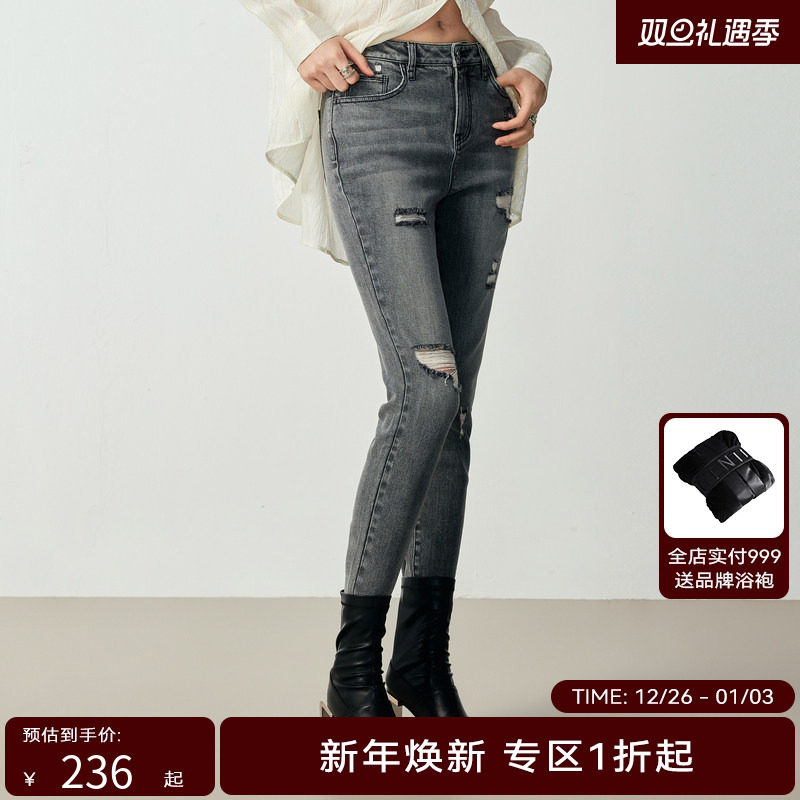中腰牛仔裤ABLE JEANS女士黑色紧身弹力铅笔裤春秋破洞提臀小脚裤