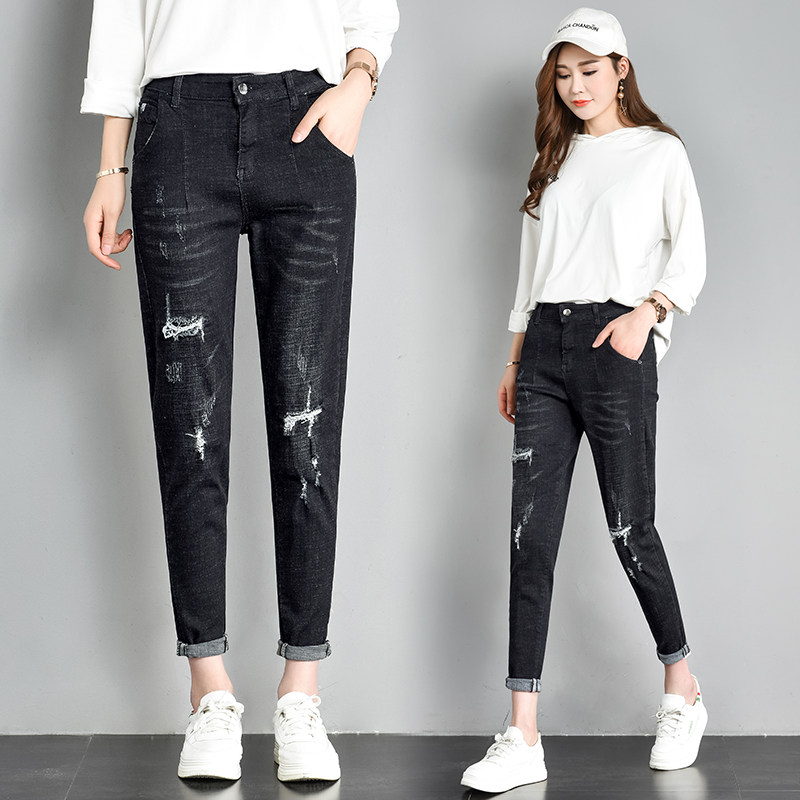 实拍~牛仔裤女新款高腰宽松显瘦黑色破洞哈伦裤小脚萝卜裤老爹裤