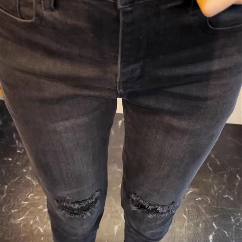 灰黑色破洞牛仔裤女2024新款春秋款高腰修身显瘦小个子小脚九分裤