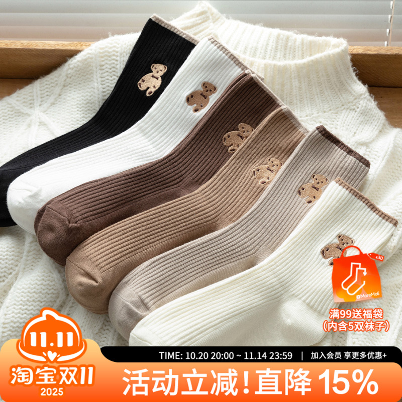 小熊袜子女中筒可爱日系ins潮韩国秋冬季纯棉加厚长袜春秋堆堆袜
