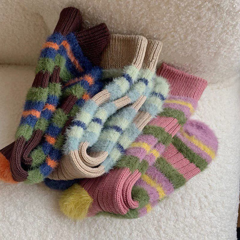 毛绒条纹中筒袜子女秋冬保暖韩国居家ins个性条纹水貂绒堆堆袜潮