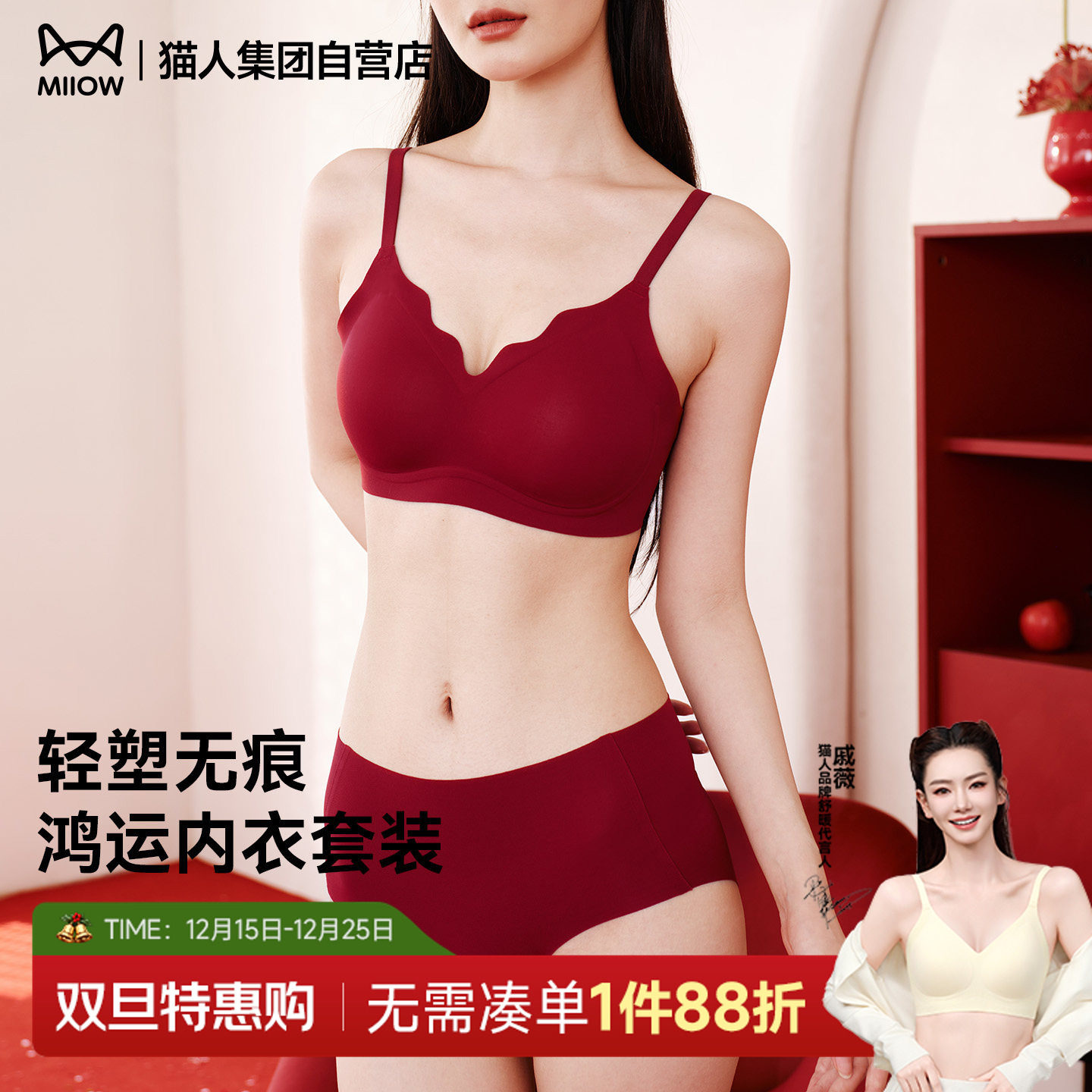 猫人红色内衣套装聚拢收副乳防下垂2026马年本命年无痕文胸无钢圈
