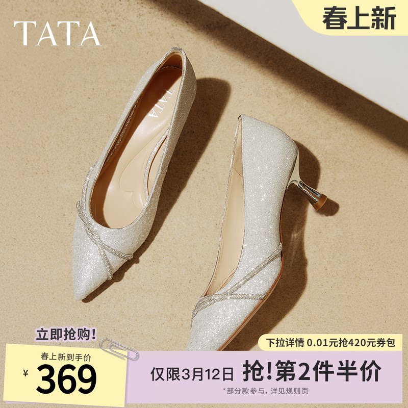 TATA他她尖头高跟鞋女细跟婚鞋新娘鞋伴娘鞋通勤浅口单鞋7QT08AQ5