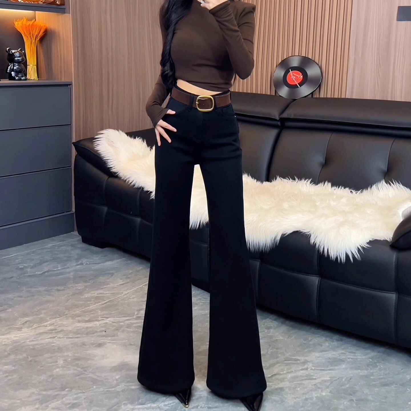 黑色高腰加绒微喇牛仔裤女2025冬季新款宽松显瘦百搭直筒喇叭长裤