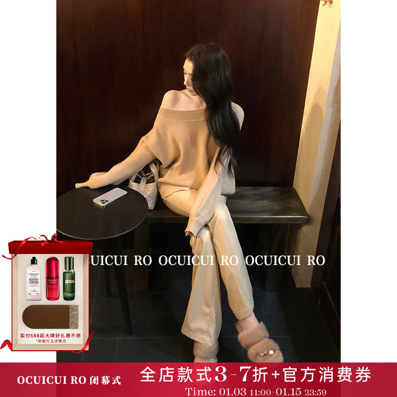 CUICUI崔崔【暮光烤雪】羊毛斜肩一字肩针织毛衣上衣休闲皮裤套装