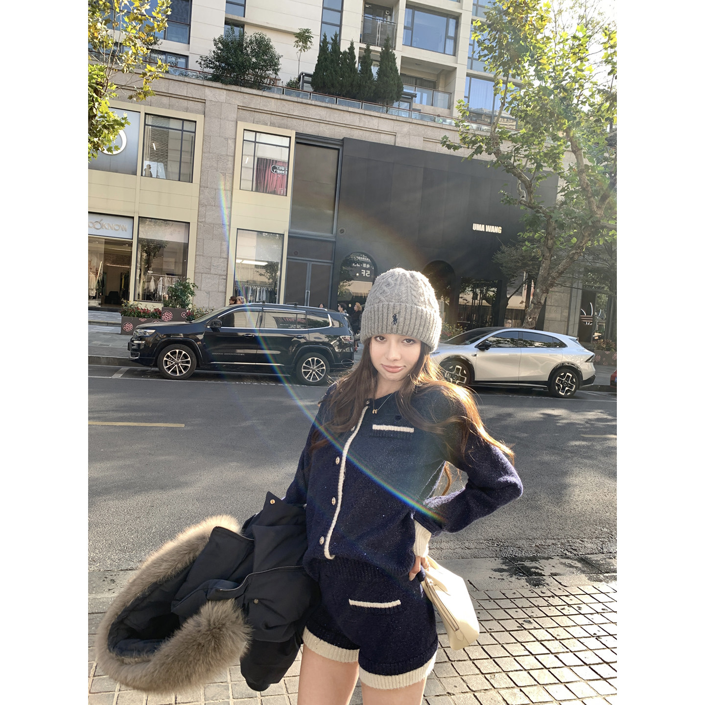 落落狷介一整套入秋穿搭毛衣套装裤女V领长袖上衣+针织短裤两件套