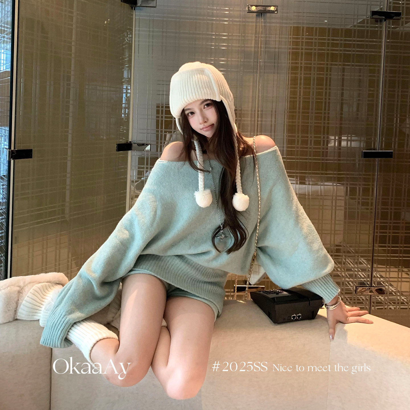 Okaaay【淡人舒适区】慵懒风斜肩长袖毛衣套装秋季休闲短裤两件套
