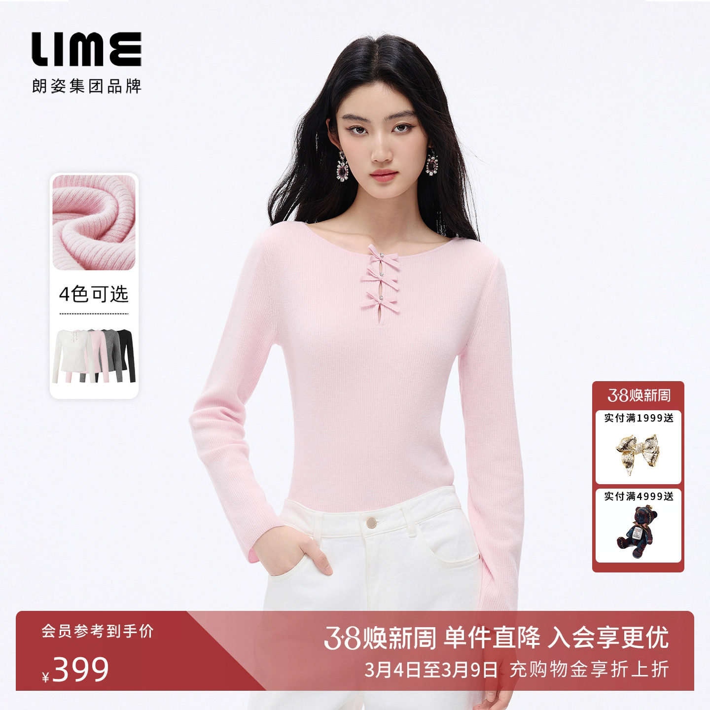 朗姿/LIME莱茵法式浪漫蝴蝶结镂空羊毛针织衫正肩长袖26年春新款