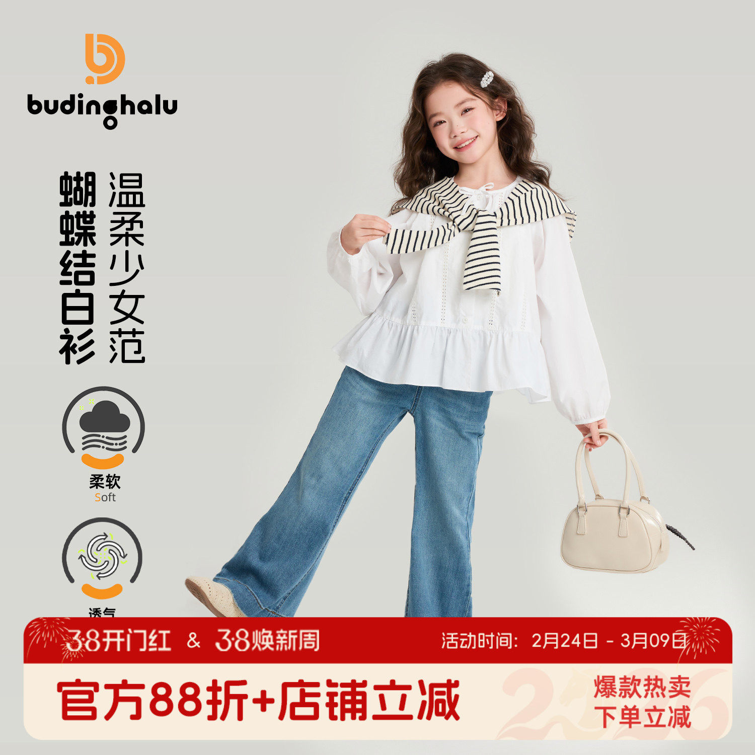 布丁哈鲁春装女童童装甜美上衣2026春季新款儿童简约蝴蝶结小衫