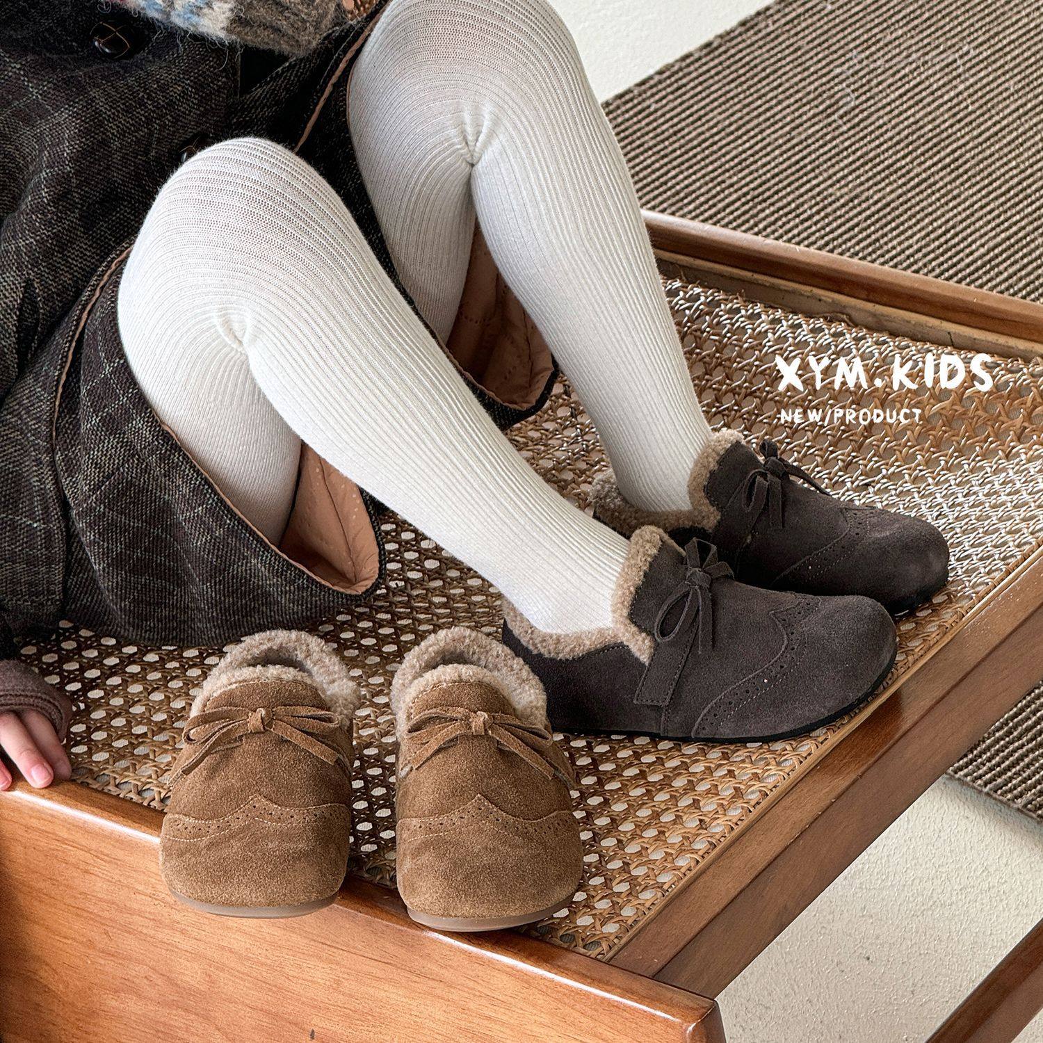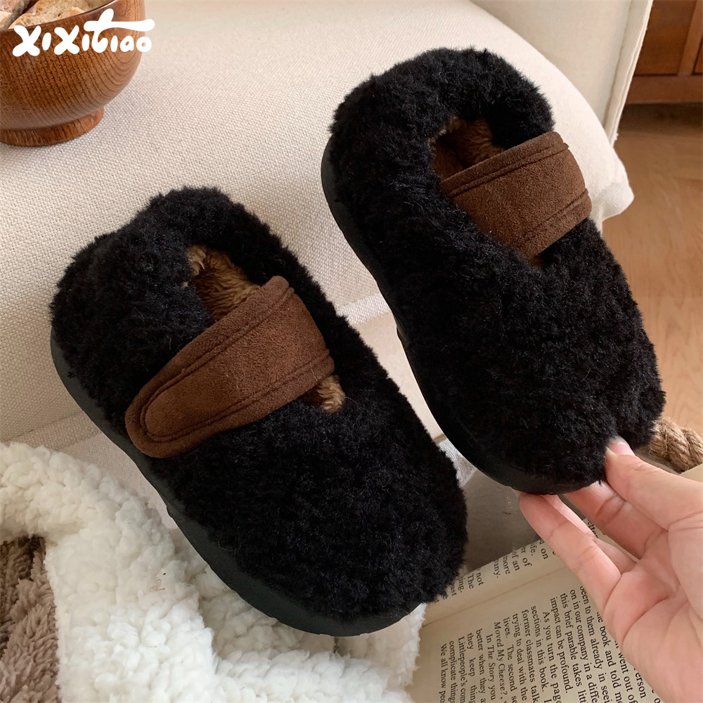 细细条 保暖儿童豆豆鞋休闲平底加绒男童女童简约魔术贴棉拖鞋冬