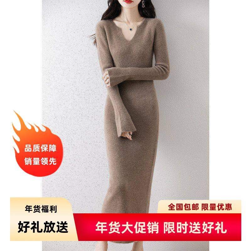 秋冬新款半开领纯羊毛连衣裙喇叭袖修身包臀针织打底裙中长毛衣裙