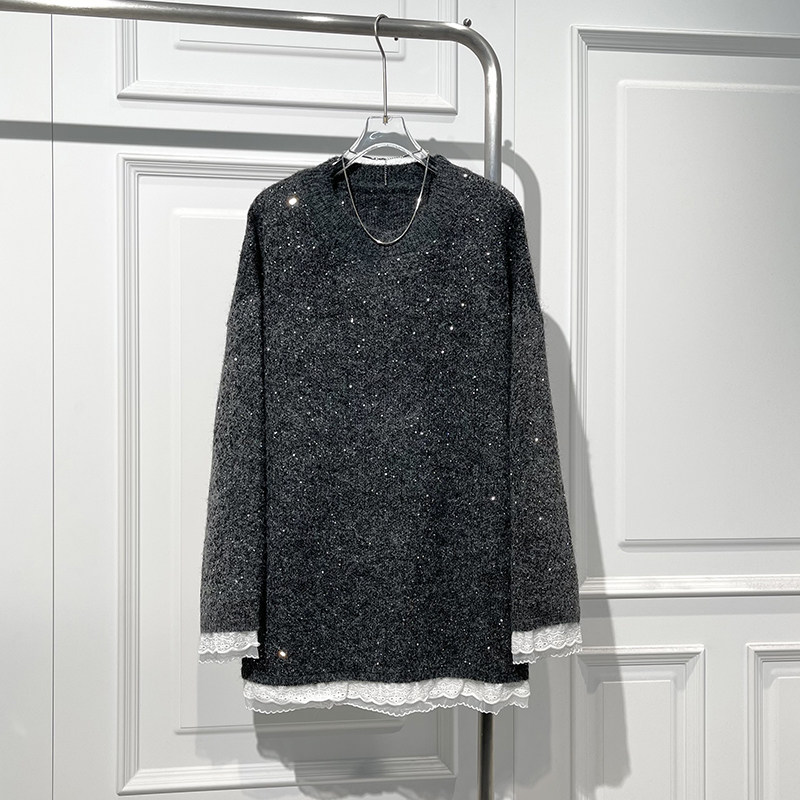 韩系百搭亮片拼接设计感中长毛衣女冬季新款宽松显瘦舒适针织上衣